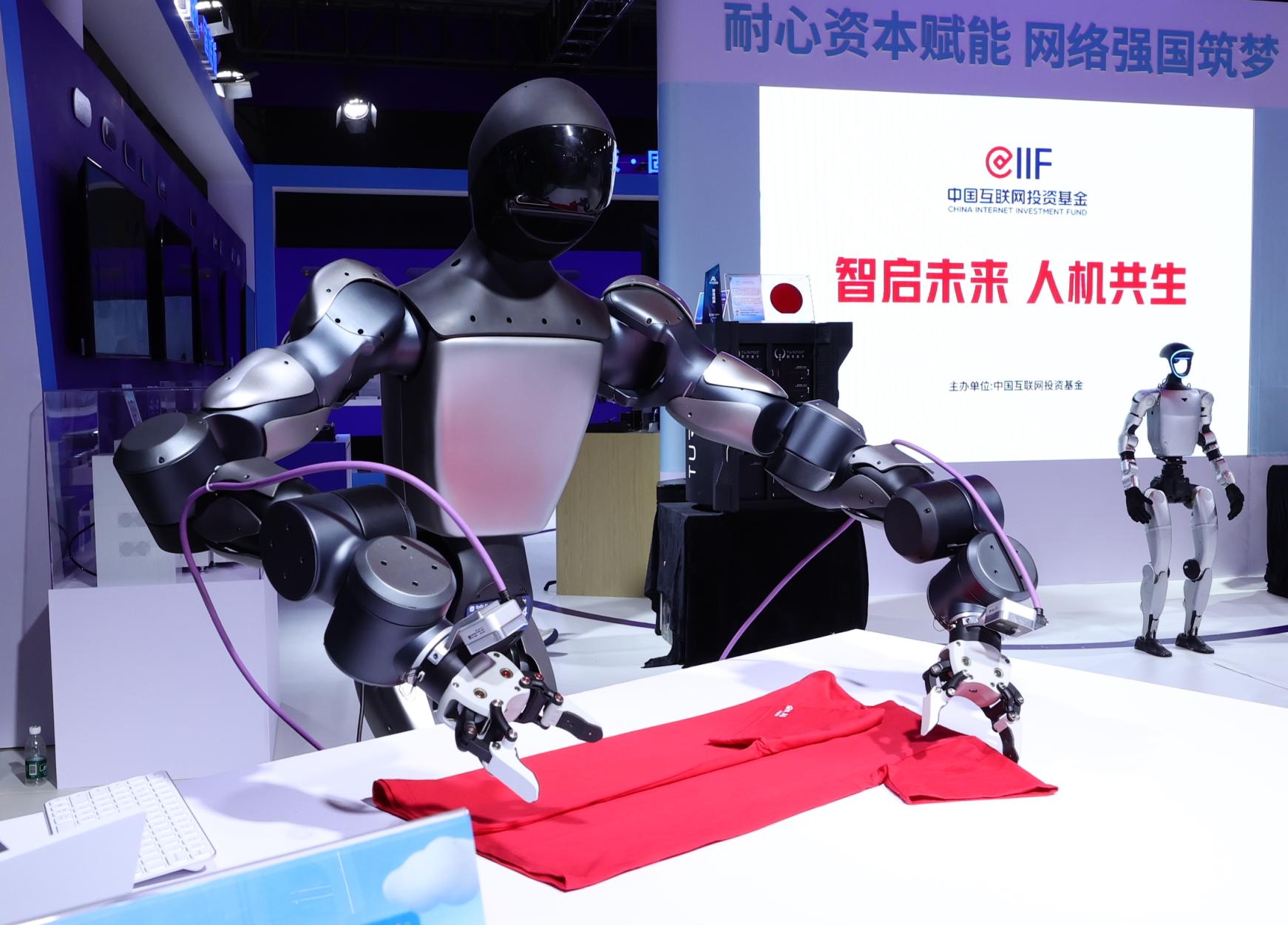 “墨子”具身机器人正在用灵巧的机械手臂叠衣服。